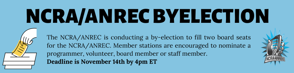 To participate as a candidate in this by-election, you must complete the online nomination form by 4pm ET, Friday November 14 (you will need a “Endorsement*). On November 17th, nominee details will be distributed by email to all NCRA/ANREC member stations, along with voting details. Members will have until November 21st to submit their vote and the elected representatives will be announced on November 26th.