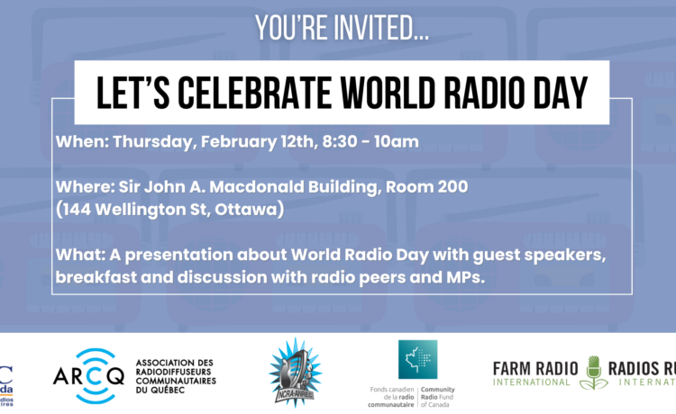 The National Campus and Community Radio Association (NCRA/ANREC) and Farm Radio International (FRI), among others, to celebrate World Radio Day event in Ottawa.
